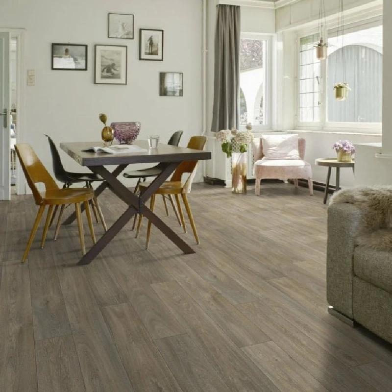 Weathered gray-brown wood-effect vinyl plank flooring