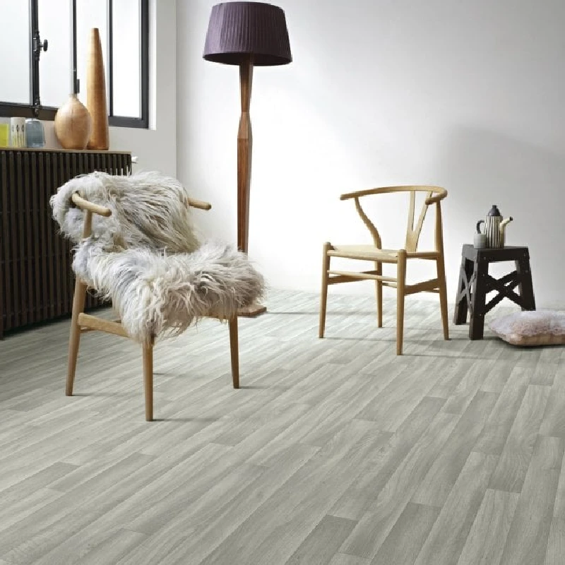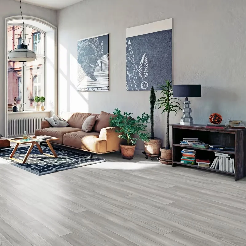 weathered wood-look vinyl flooring in a minimalist living room.