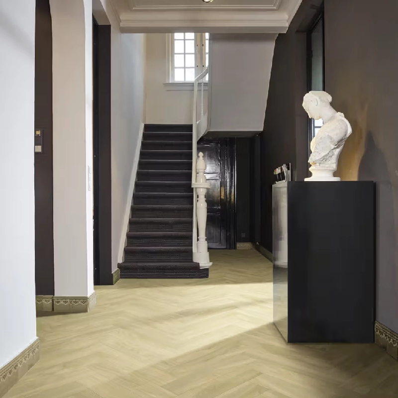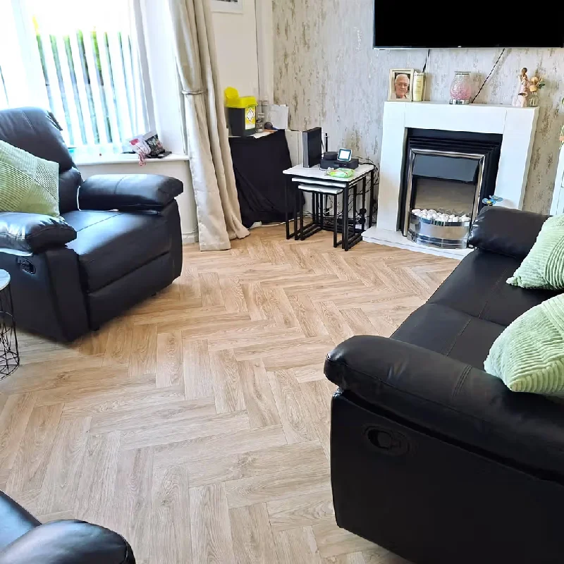 SPC flooring in a light, blonde oak wood grain herringbone design